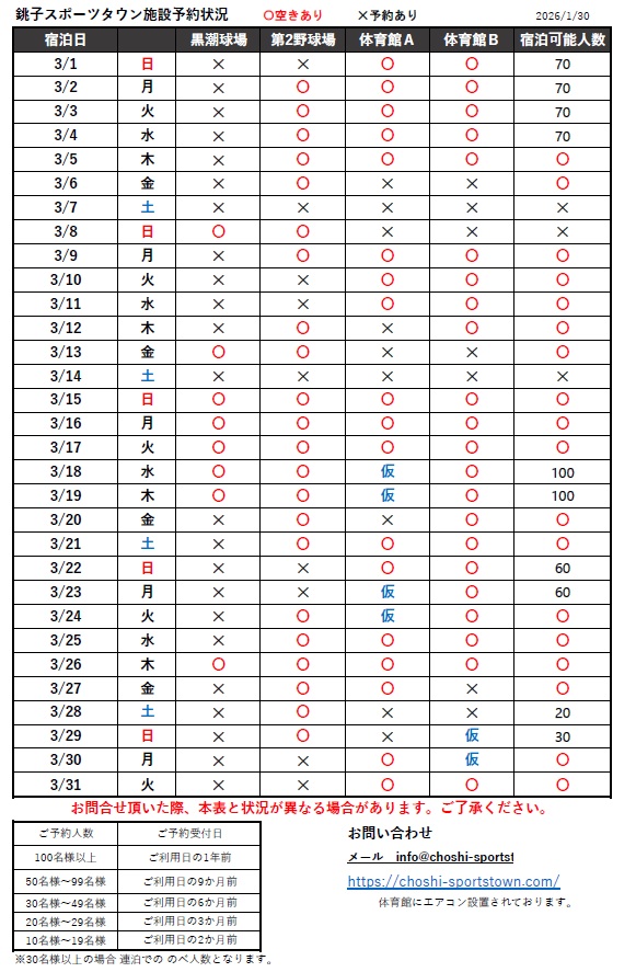 当施設の仮予約は1週間となっております。 仮予約が解除されて空く場合もございます。
