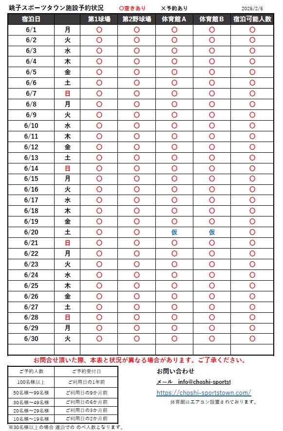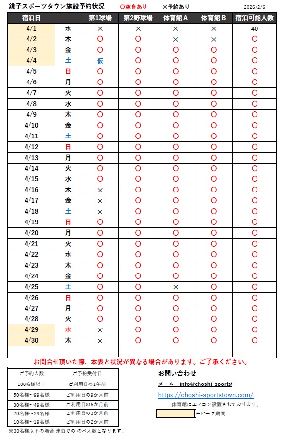 2026年4月~8月の施設予約状況です。 2月6日更新