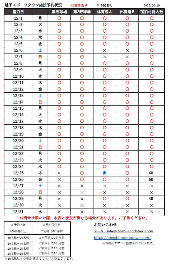 当施設の仮予約は1週間となっております。 仮予約が解除されて空く場合もございます。