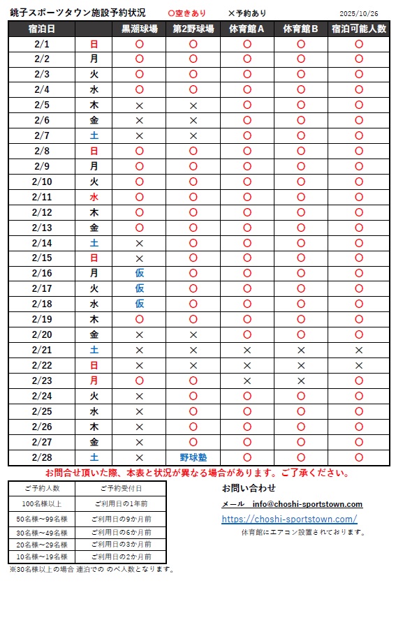 当施設の仮予約は1週間となっております。 仮予約が解除されて空く場合もございます。