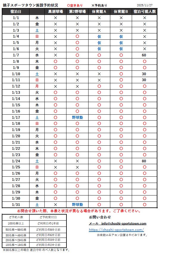 - 2026年1月の施設予約状況です。 11月27日更新