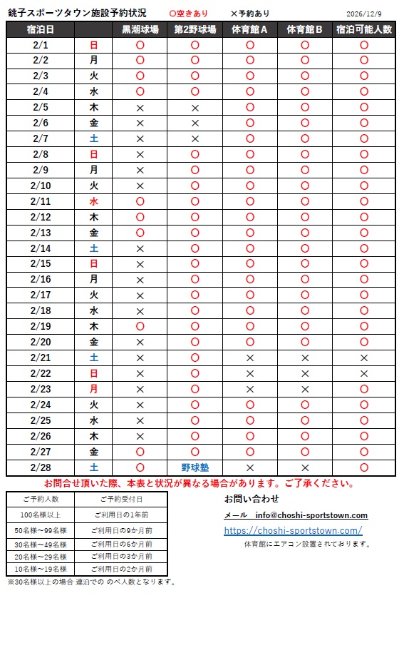 2026年2月の施設予約状況です。 12月9日更新